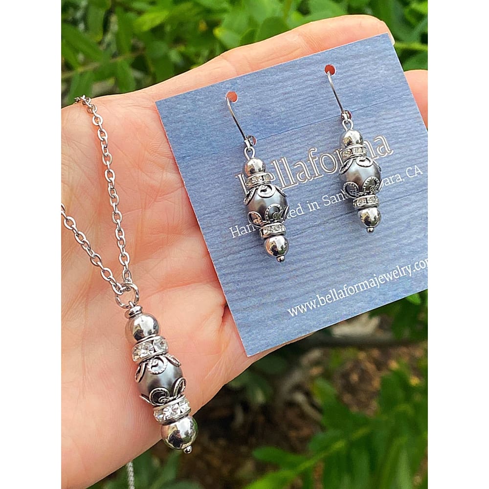 A beautiful quality 10mm glass pearl pendant in your choice of white, taupe or our latest charcoal gray. Accented with filigree beadcaps, large crystal spacers and 8mm silver rounds. Pendant is 1 1/4” long.