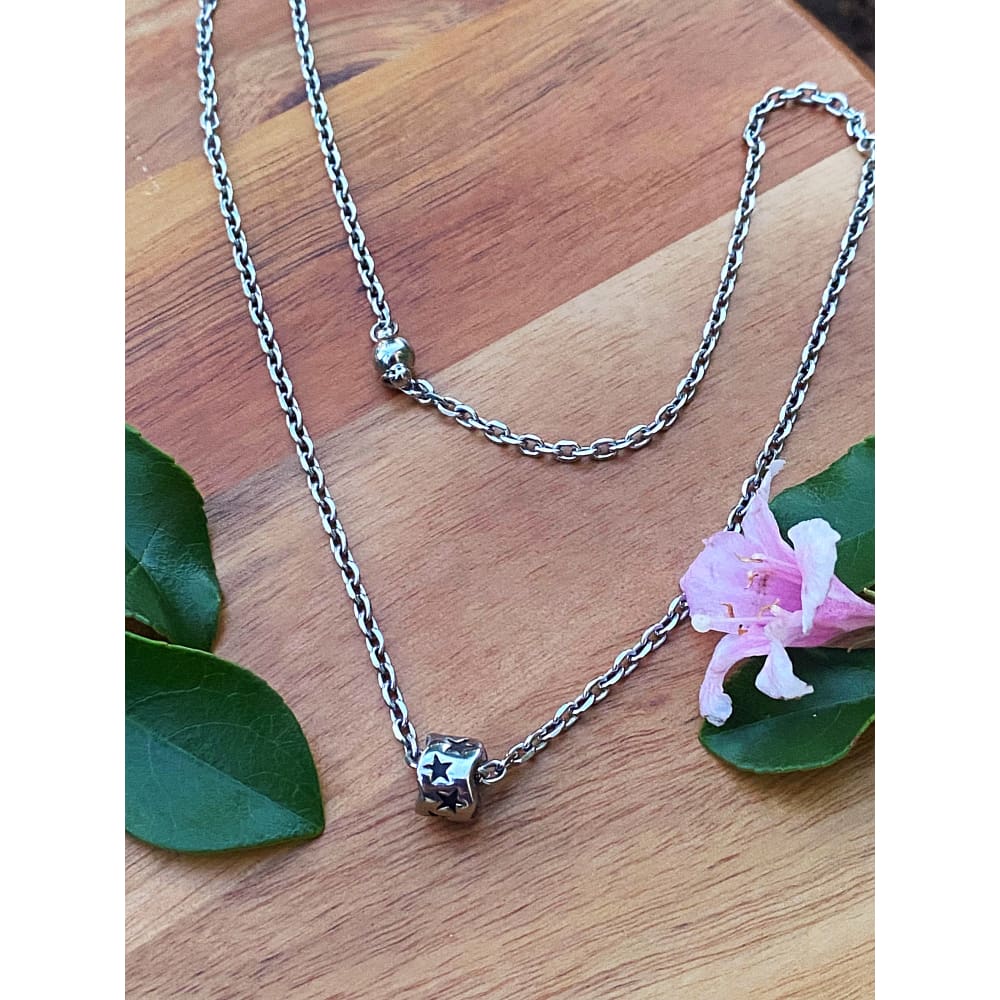 9x7mm quality European rondelle bead with antique blackened silver stars hung on a silver chain. (bead size is approximately 1/4” diameter)