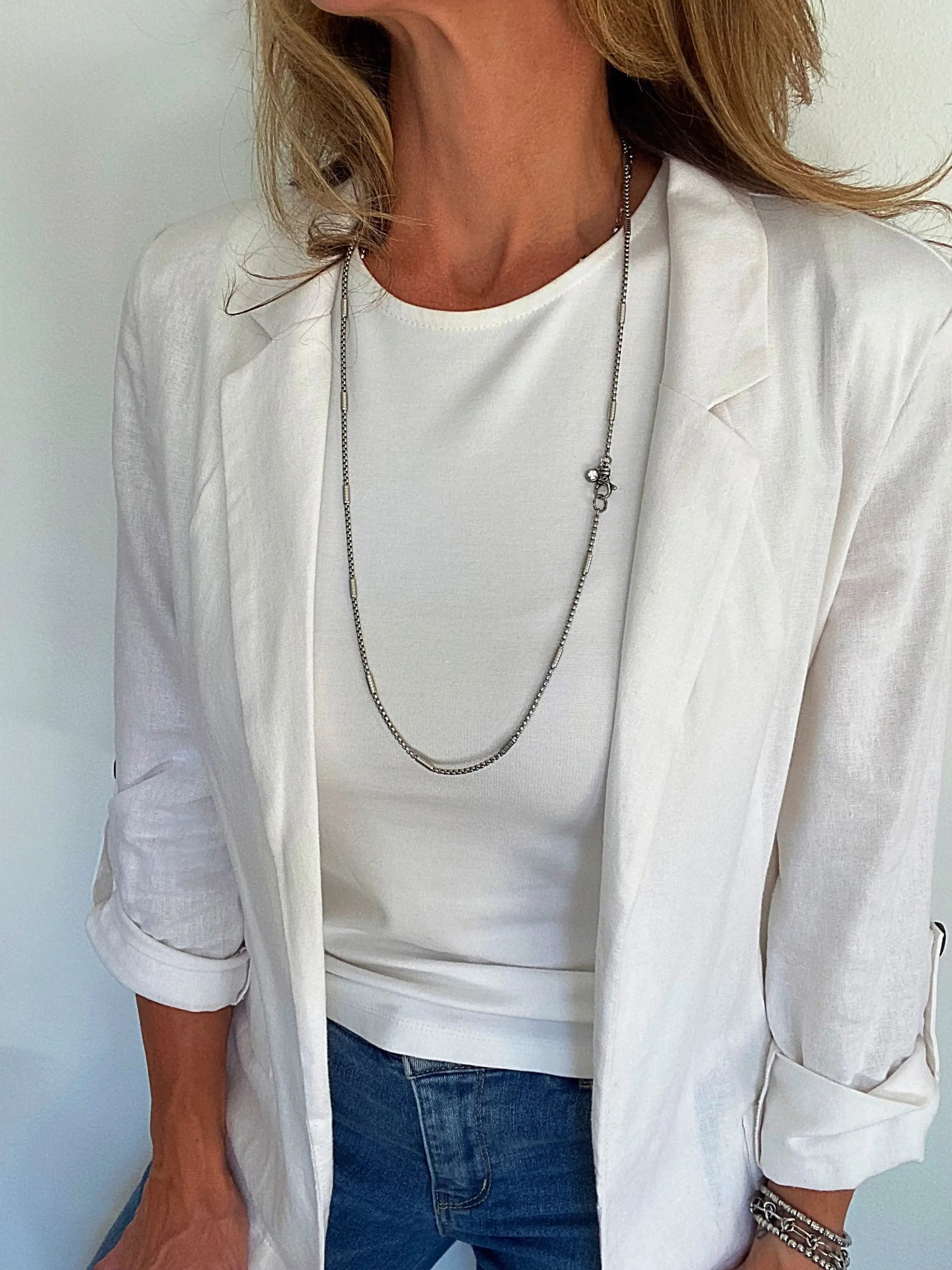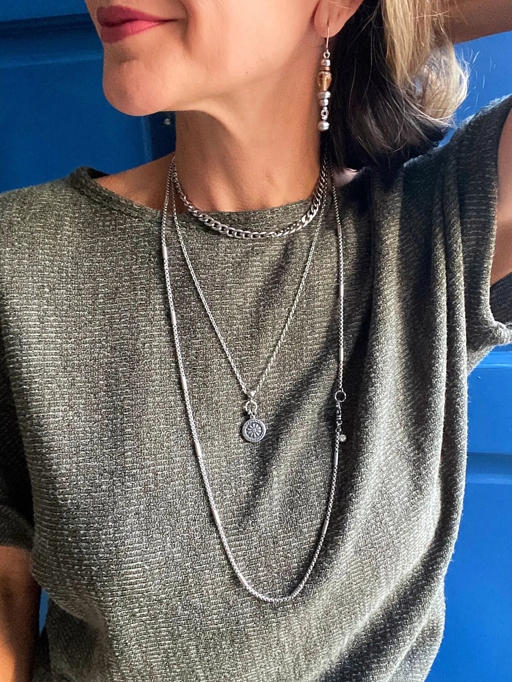 Available in 8 different lengths. Depending on your neck size the longer lengths can be doubled for versatile layering. Shown wearing 30”.