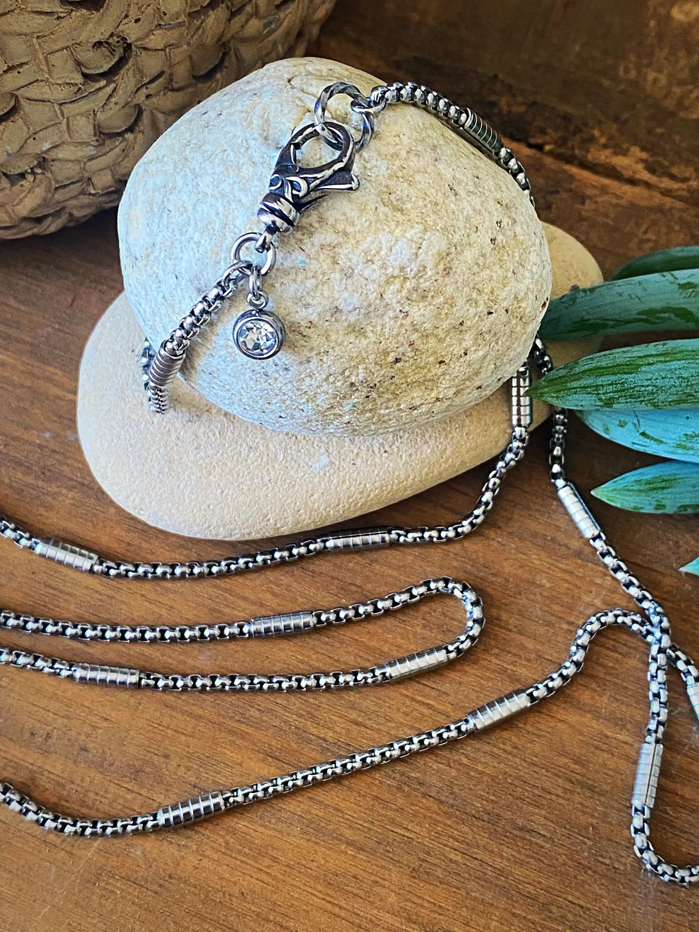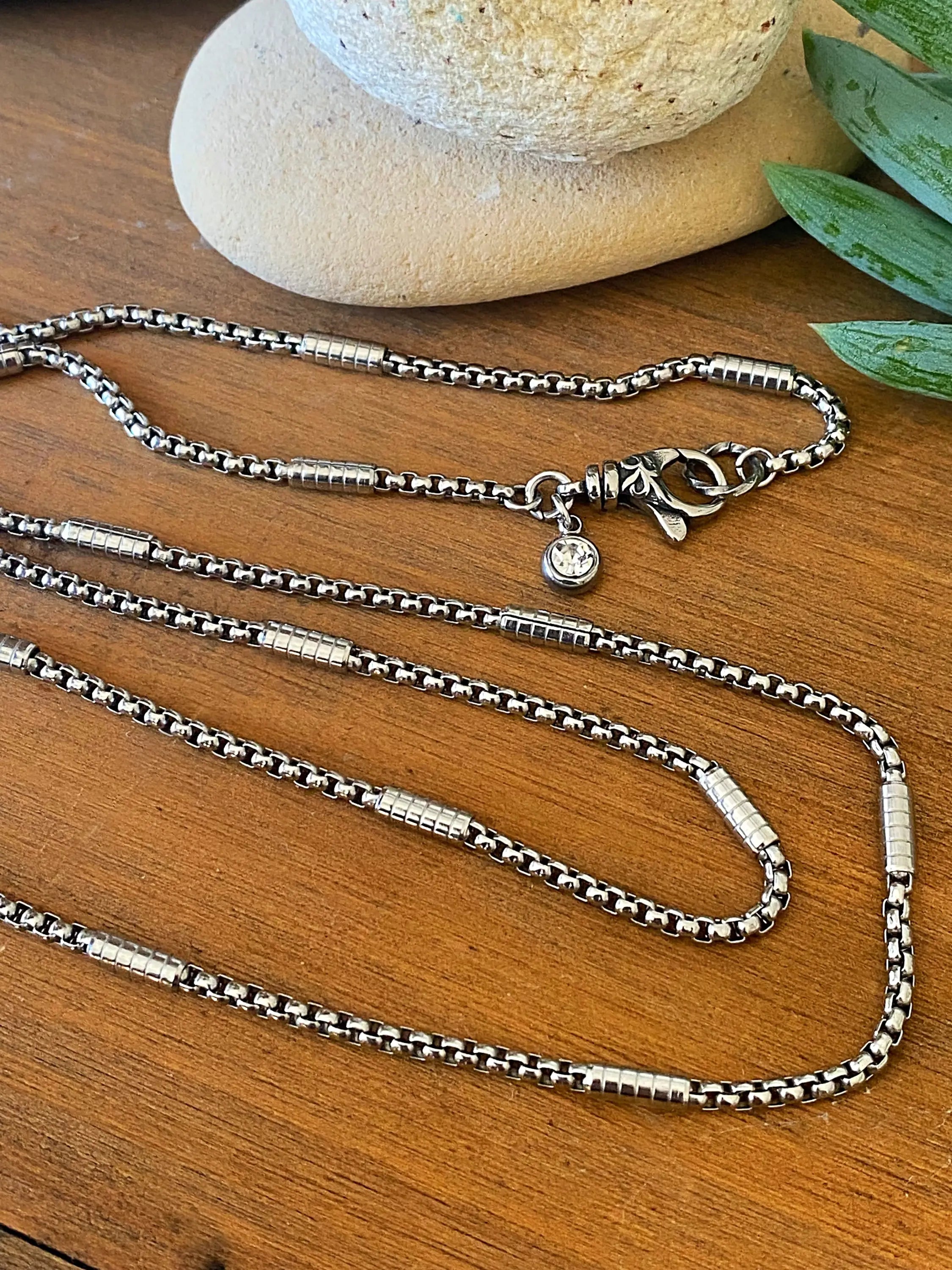Column layering necklace with unique Tibetan style clasp. This smooth box chain has spaced column beads throughout.